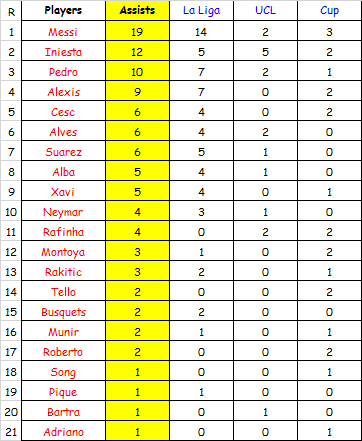 Форвард «Арсенала» Алексис Санчес завершил 2014 год с большим количеством голевых передач за «Барселону», чем его экс-партнер Сеск Фабрегас. Известный твиттер-аккаунт BarcaStat, собирающий интересную статистику о каталонской команде, подвел итоги уходящего года. По количество ассистов за сине-гранатовых Алексис уступил только Лионелю Месси, Андресу Иньесте и Педро – на его счету 9 голевых передач. Фабрегас, в свою очередь, в 2014 году лишь шесть раз ассистировал партнерам.