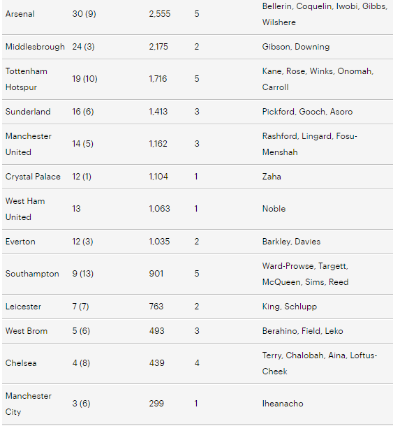 «Арсенал» лидирует в АПЛ по числу задействованных в сезоне футболистов собственной академии. Эктор Бельерин, Франсис Коклен, Алекс Ивоби, Киран Гиббс и Джек Уилшер, который сейчас играет за «Борнмут» на правах аренды, суммарно сыграли в 39 матчах и провели на поле в общей сложности 2555 минут. По пять воспитанников также у «Тоттенхэма» (1716 минут) и у «Саутгемптона» (901 минута).  Пять команд английского чемпионата вообще не имеют в своих составах выпускников собственных академий. Это «Уотфорд», «Борнмут», «Халл Сити», «Суонси» и «Сток Сити».