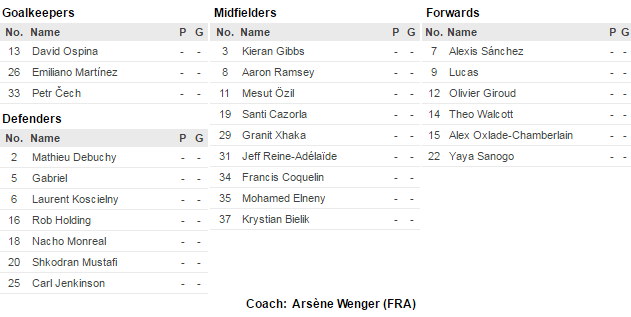 Доморощенные (т.е. зарегистрированные в федерации, в нашем случае английском или валлийском клубе в течении 36 месяцев до достижения 21-летия постоянно или прерывно в сумме): Мартинес, Холдинг, Дженкс, Гиббо, Рэмси, Коклен, Тео, Окс.
