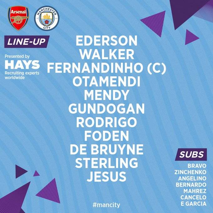 Эдерсон – Уокер, Фернандиньо, Отаменди, Менди – Гюндоган, Родри, Фоден – де Брюйне, Габриэл Жезус, Стерлинг.