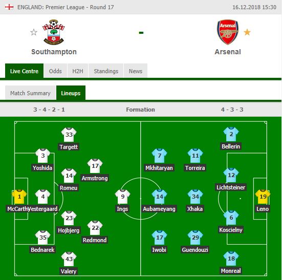 Лено – Беллерин, Лихтштайнер, Косельни, Монреаль – Торрейра, Джака, Гендузи – Мхитарян, Обамеянг, Ивоби.