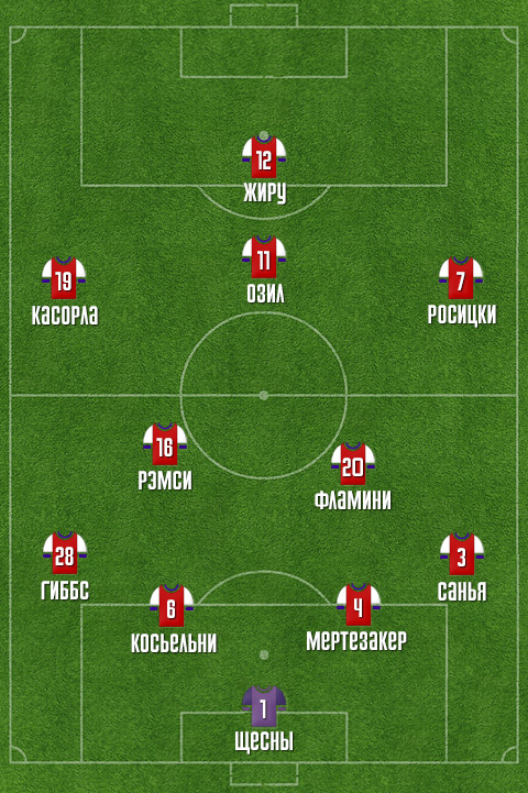 Смеем предположить, что Венгер решится предоставить отдых Артете, и в паре с Фламини в опорной зоне сыграет Аарон Рэмси. Возможно, не выйдет на поле с первых минут и Джек Уилшер. Место на левом фланге полузащиты мы отдадим Санти Касорле, а вот справа могут быть варианты в виде Томаша Росицки или Тео Уолкотта. Так или иначе, мы ожидаем, что оба завтра непременно сыграют определенное количество минут.