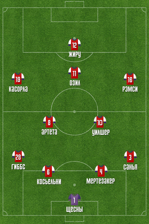 К сожалению, из-за перебора желтых карточек завтра на поле не сможет выйти Матье Фламини. Его место рядом с Микелем Артетой, скорее всего, займет Джек Уилшер, оправившийся от травмы. Арсен Венгер уже обрадовал болельщиков новостью о выздоровлении Тео Уолкотта. Босс заявил, что вингер должен принять участие в матче, однако вряд ли Тео с ходу займет место в стартовой обойме. Поэтому на флангах полузащиты мы ожидаем увидеть Санти Касорлу и Аарона Рэмси.