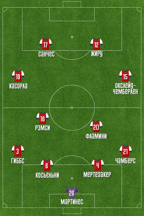 В центре полузащиты вариантов нет — Рэмси и Фламини. На флангах также вряд ли стоит ожидать изменений. Слева номинально выйдет Касорла, справа — Окслейд-Чемберлен. Касаемо пары нападающих, весьма вероятно, что Жиру в основе заменит Уэлбека. Появление в старте Санчеса вопросам не поддается.
