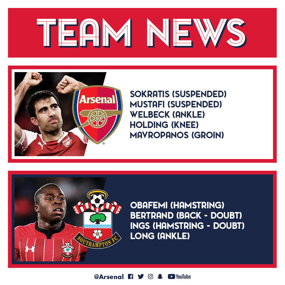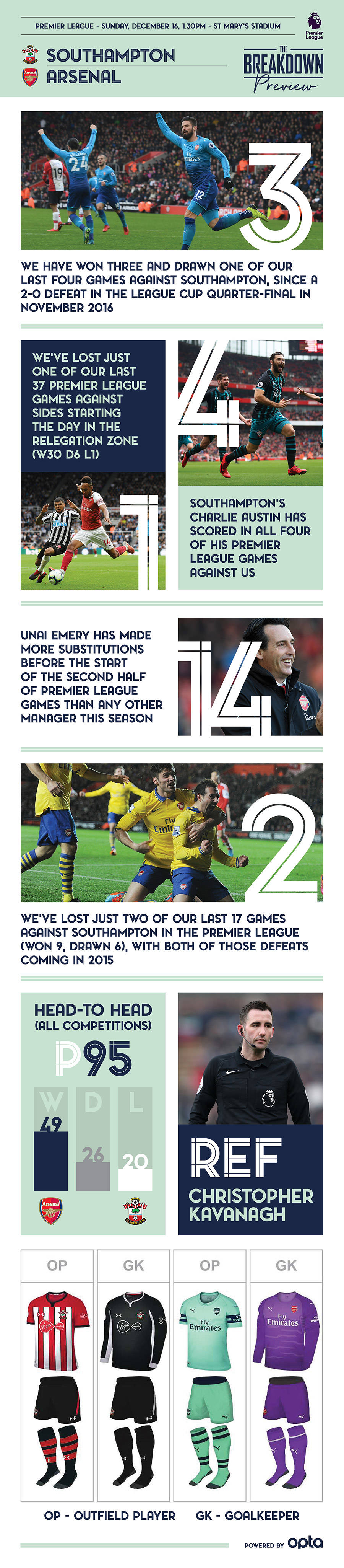 Сегодня в матче семнадцатого тура Премьер-Лиги «Арсеналу» предстоит сыграть выездной матч с «Саутгемптоном». В 16:30 (мск) на «Сент Мэрис» сойдутся один из аутсайдеров чемпионата и команда, не знающая поражений в 22 матчах подряд во всех соревнованиях.